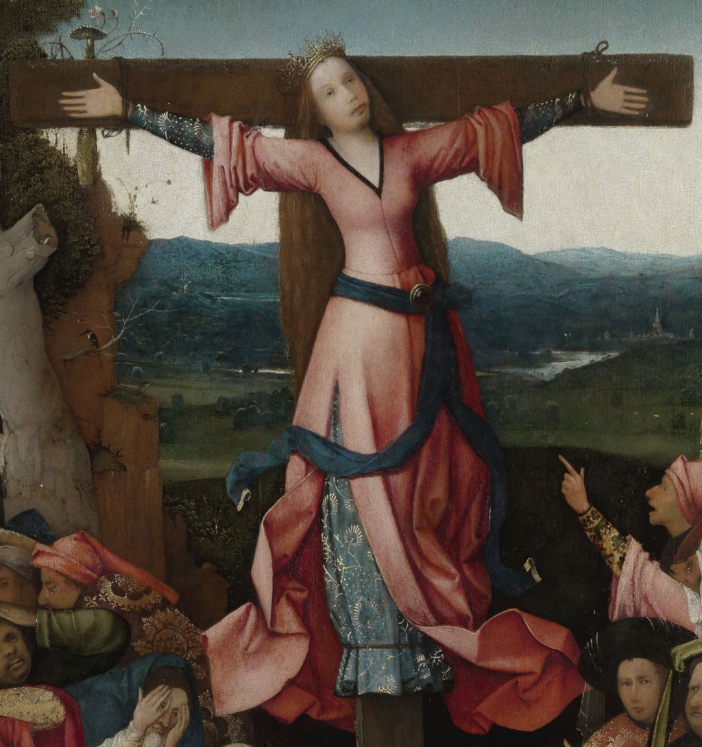 There are remarkably few triptychs whose central panel shows the crucifixion of a female martyr. Although there were ample female martyrs, they were almost invariably killed by beheading or other means. There are two possible identities which have been suggested for this painting: Saint Julia of Corsica, and a completely fictional ‘folk saint’ popular in the Middle Ages, known variously as Saint Wilgefortis, Uncumber, or Liberata.