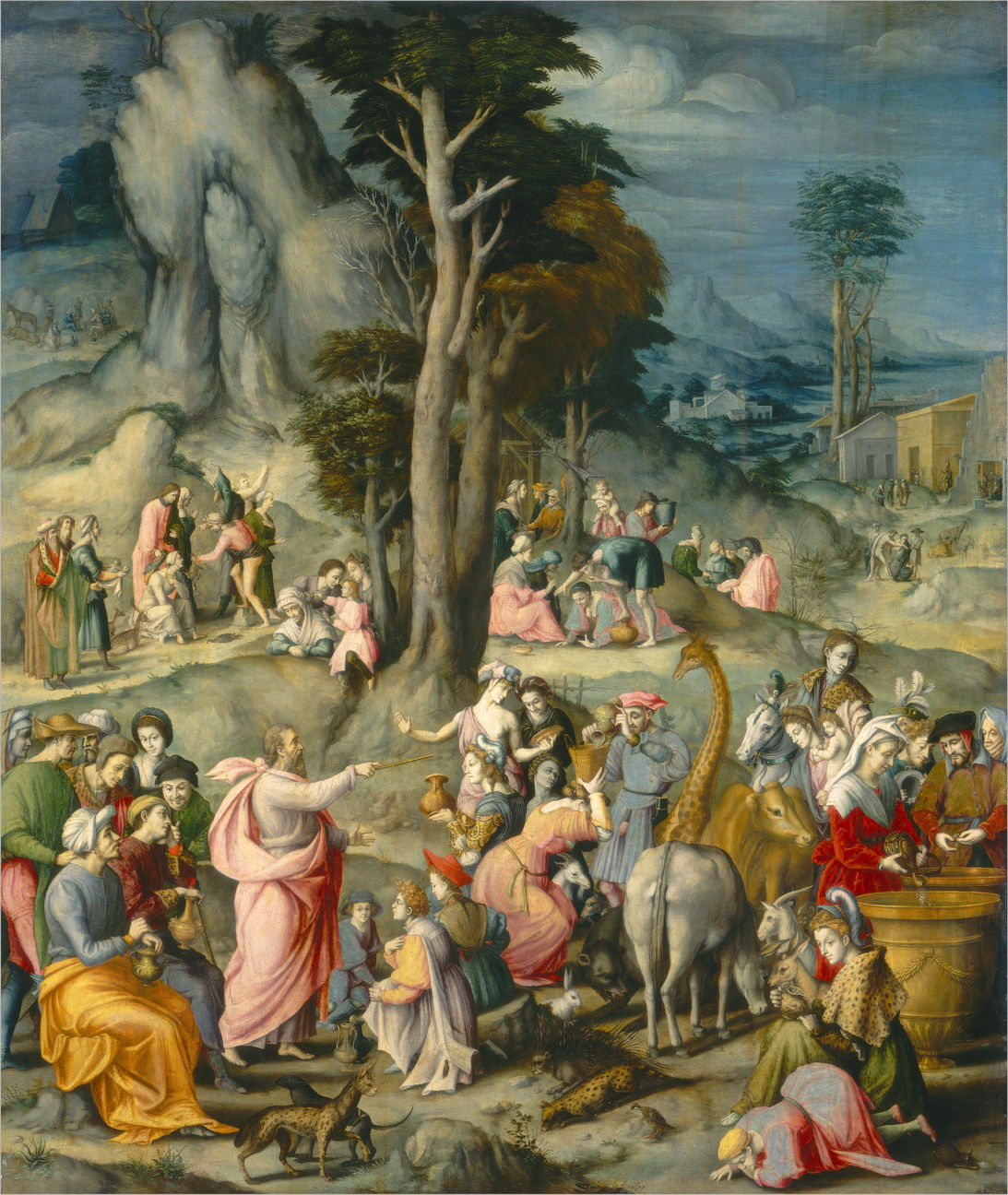 At about the same time as Bronzino was painting his version, Bacchiacca was attempting something more novel and ambitious. Moses holds his staff as a pointer, at the lower left, which leads us to a menagerie of exotic animals. There are signs of manna being gathered, and a group of people are sat behind Moses apparently approving of the way that things are going. This covers the third and fourth phases above, but the relevance of the animals to the narrative is unclear.