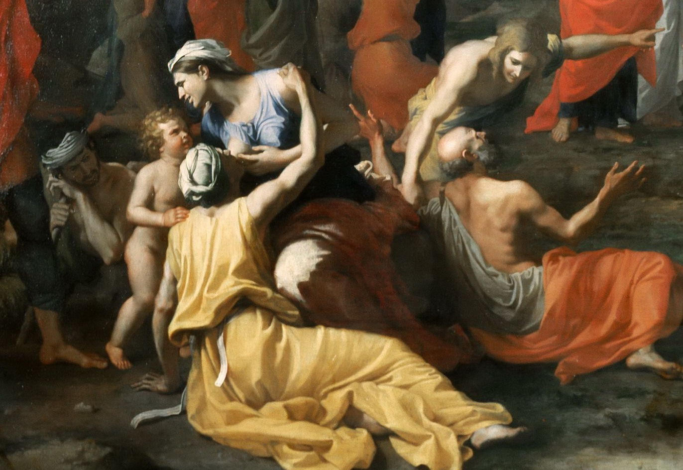 Building a bigger and more enthralling narrative, with enhanced meaning and interpretation, is a much harder problem for the painter. Only by abandoning temporal unity was Poussin able to tell the complete story with its peripeteia. That called for an ingenious and intricate composition which employs small groups of people across the canvas, with visual links between them, and astute use of light and colour.