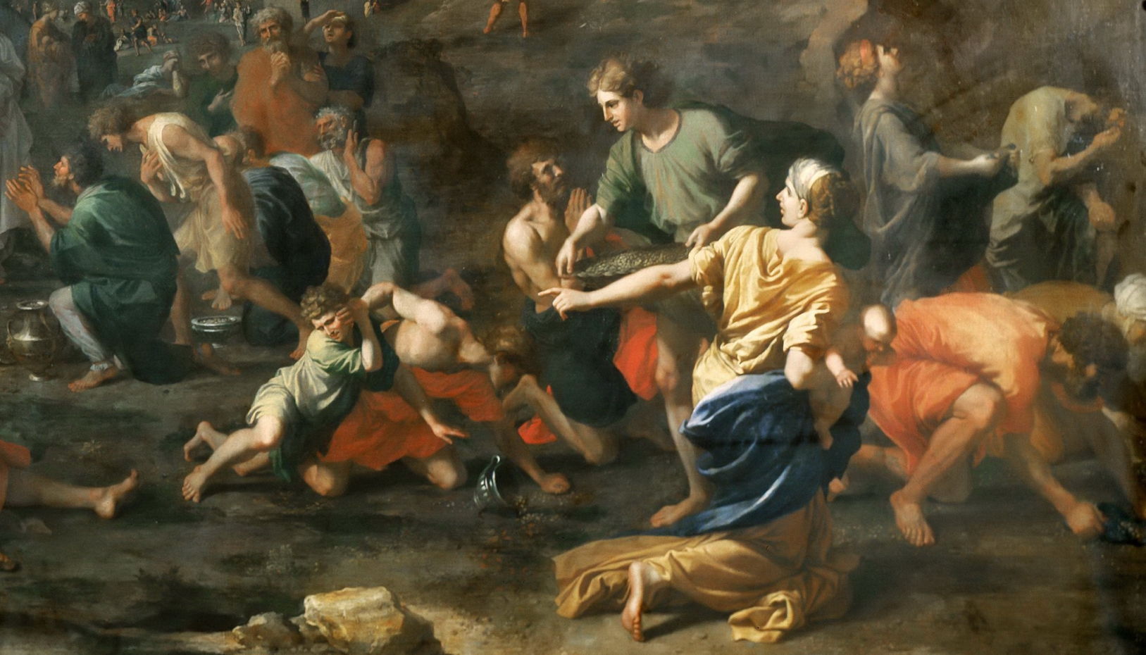There are further details which you can read, and several excellent accounts to help you do so. But it is clear that Poussin abandoned temporal unity – his painting does not depict a single moment in time – in order to tell us the complete story. In doing so, he alone has depicted the peripeteia, the dramatic improvement in the fortunes of the Israelites.