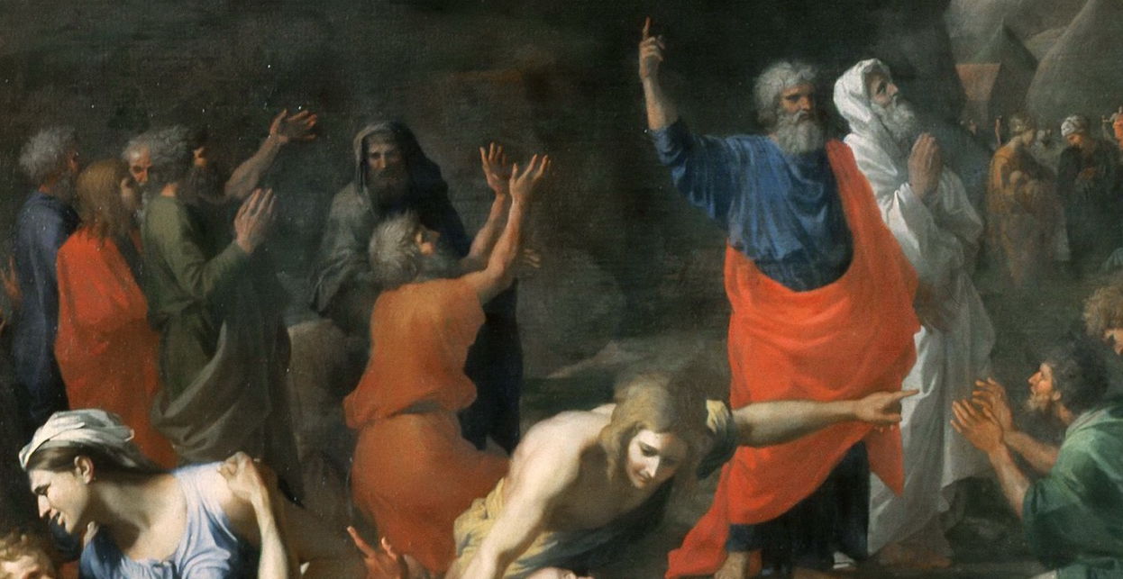 Behind and to the left, a cluster of about eight men seem to be expressing their gratitude in deliverance, and some look left and up towards the figures of Moses and Aaron.