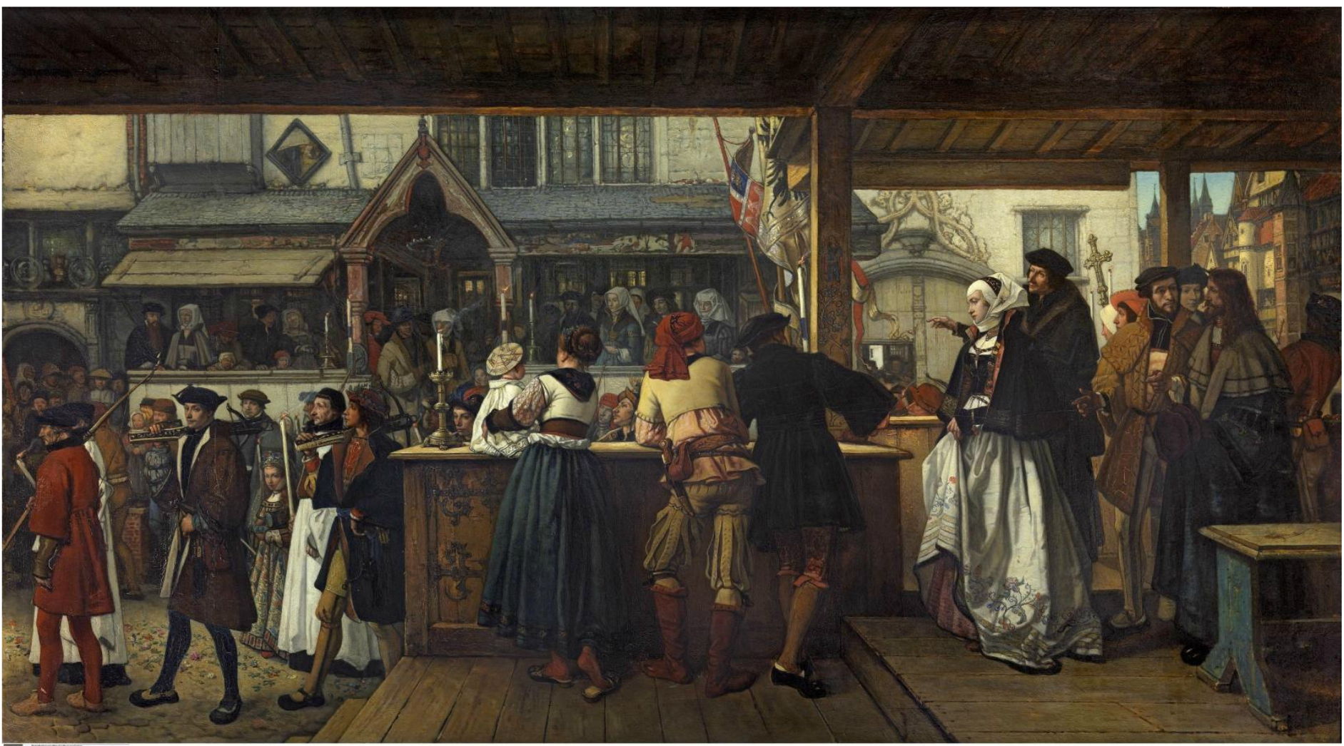 Henri Leys’ Albrecht Dürer visiting Antwerp in 1520 (1855) gives a good idea of the paintings that Tissot admired most: realist in detail, dominated by earth colours with a wide tonal range but tending towards the dark, and showing gentle historical stories built from a multitude of figures. Like many painters of the day, Leys did not go for the climax or peripeteia of thrilling or strongly emotional stories. He also painted at least one scene derived from Goethe’s Faust.