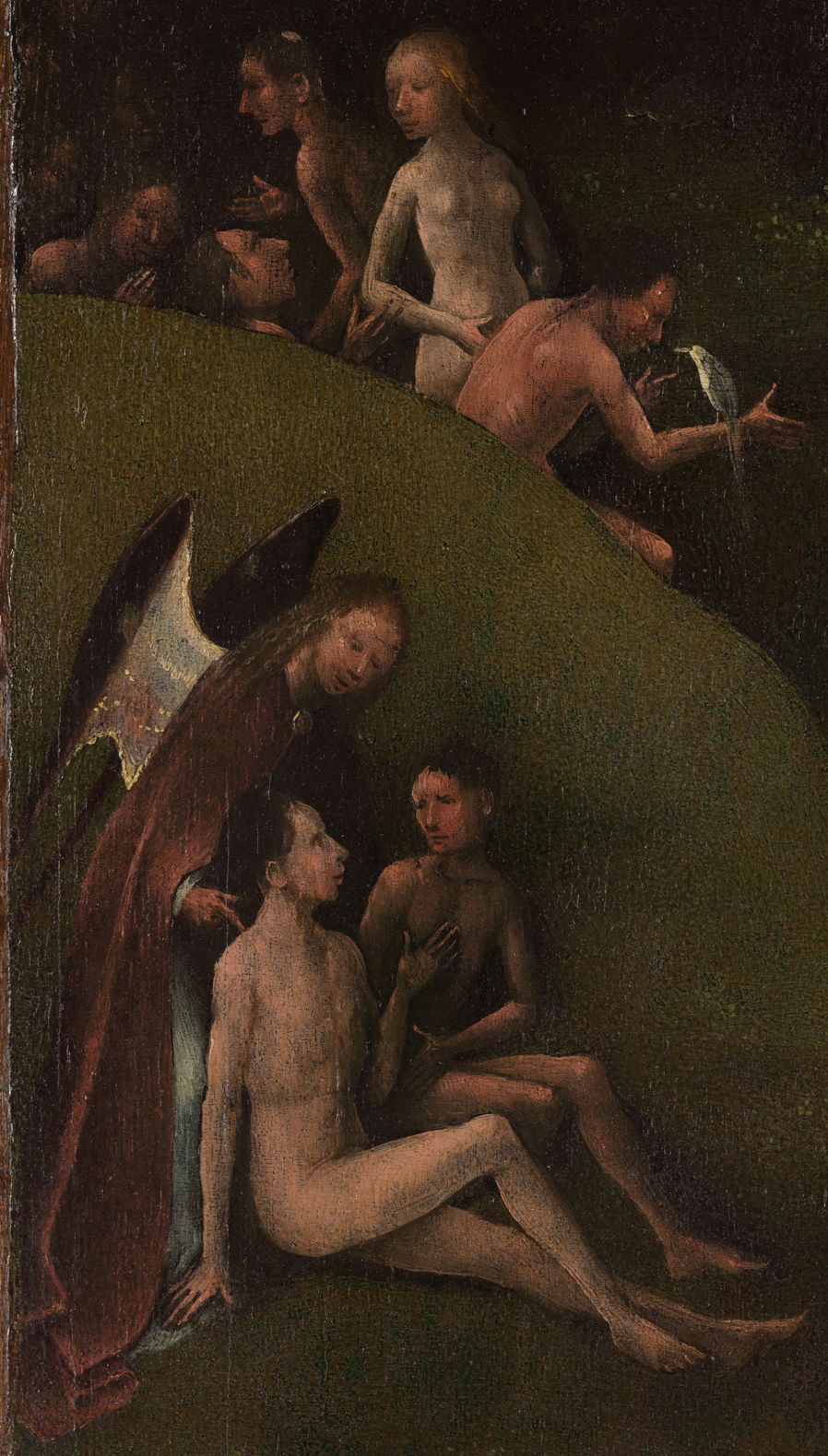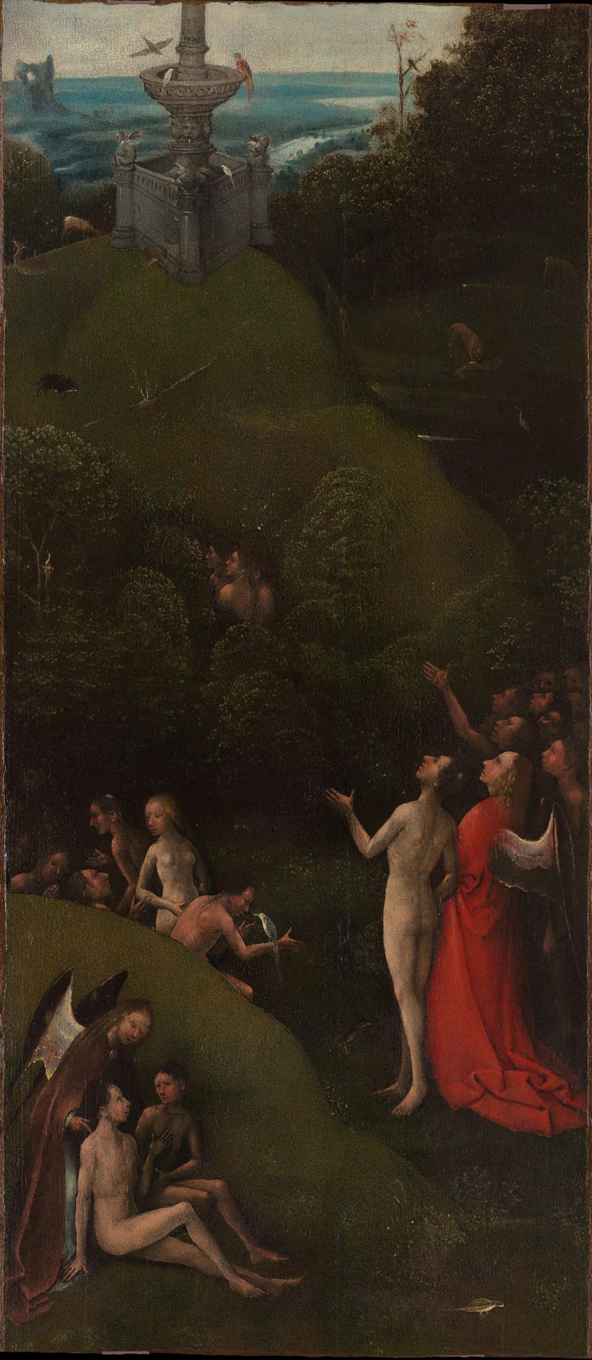 Four distinct groups of naked figures are in the foreground, two of which have accompanying winged angels. Closest is a couple, seated on a hillside at the left and talking with an angel wearing a brown cloak. Slightly further away to the right is a larger group of ten human figures with an angel in a scarlet robe. They are all looking up to the left of the painting, and two are extending their arms in that direction.