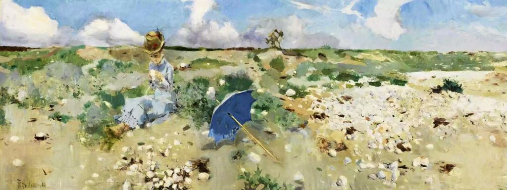 His wife Alice was his favourite model, and his most recurrent subject from the time that he first painted her portrait. Portrait of Mrs Helleu with an Umbrella (1899) is a very loose sketch almost entirely in blue and white, which seems to refer to John Singer Sargent’s earlier A Gust of Wind (c 1886-7), shown below.