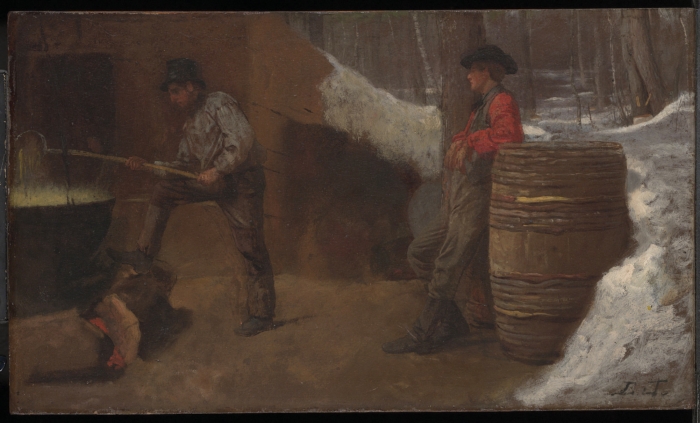 If you do not already know, or have deduced from the titles and content of Johnson’s paintings, he intended to show the production of maple sugar from the exuded sap of maple trees, in the forests of Maine and the northern part of New England. This traditionally took place somewhere towards the end of the winter and start of the spring, when the sap started to rise most strongly.