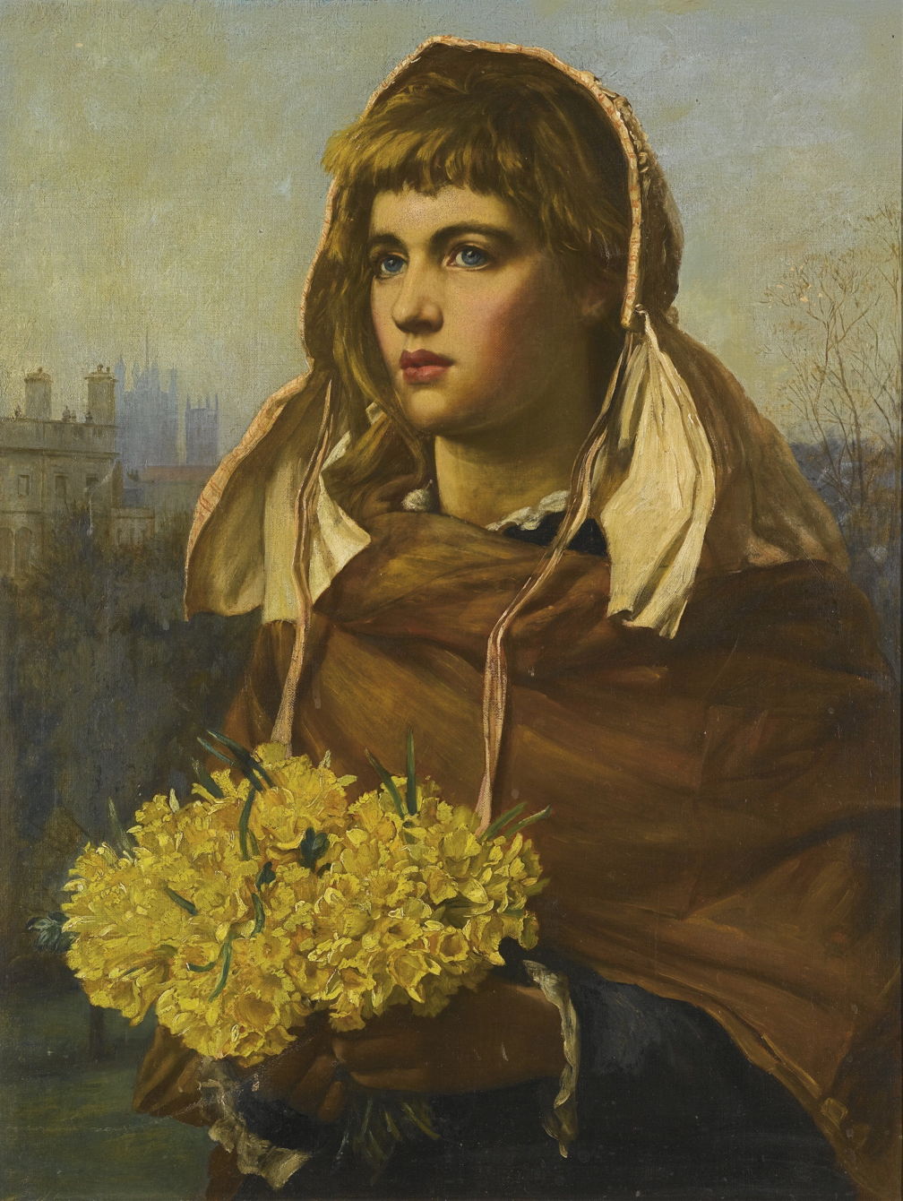 Fresh Flowers from the Country (c 1881) was a popular theme of the time, one of the many street-sellers of flowers in London. As was usual, she is immaculately clean and idealistically beautiful. This was exhibited at the Royal Academy in 1881, and that autumn at the Walker Art Gallery in Liverpool.