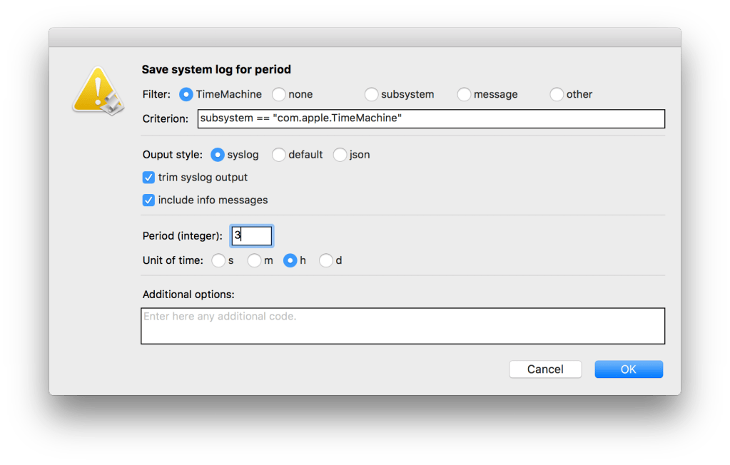 The final section allows you to add any other text you want to the log show command. If you want to try start and end times, this gives you the scope, but I do not recommend them.