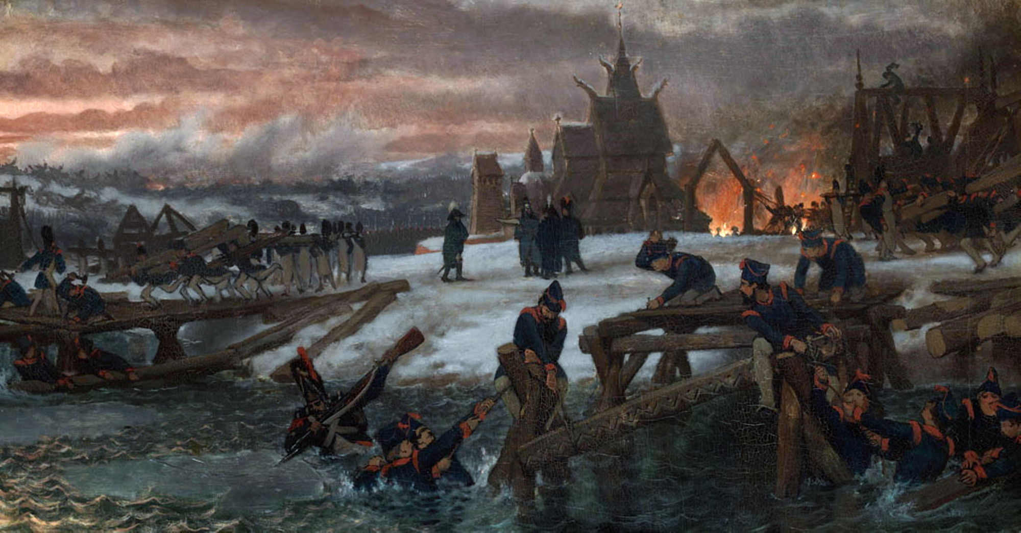 Alma-Tadema shows sappers working in freezing water to build improvised bridges across the river, which they had expected to be frozen. The two bridges which they completed allowed most of the army to cross, although the French lost around 20,000 personnel out of a total of over 80,000 (including stragglers and supporters), in this single action. The word Bérézina entered the French language as a synonym for a disaster.