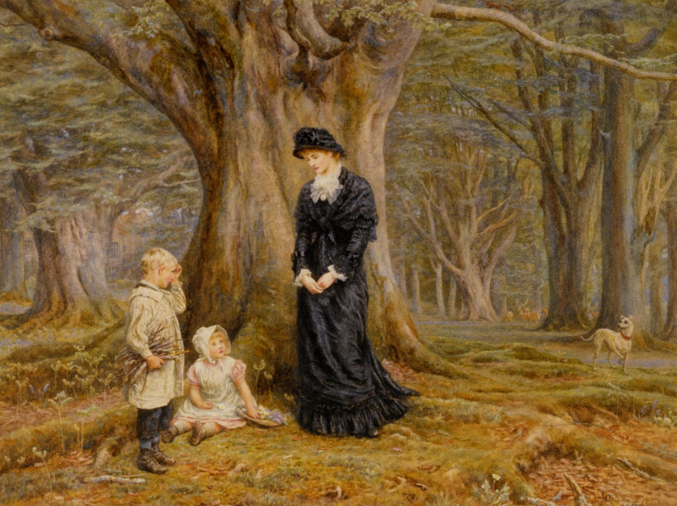 More typical of her mature work is this depiction of ancient woodland and The Lady of the Manor (1880). The manor house is just visible in the distance, behind the small boy’s head. Seen in a small clearing in the mid-right of the painting are deer, implying that this was a deer park; even then, there were few deer park remaining in the south of England.