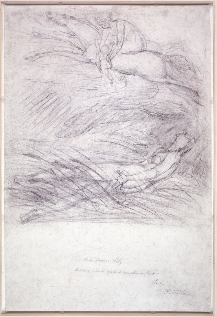 The earlier sketch in the British Museum places the paper in ‘portrait’ orientation, and it is this which suggests that this was an early painting in the series, if not the first. Blake’s design here lacks the strong linearity of the final work, with the lower woman apparently having just given birth to the baby, among rushes or reeds. Only one cherub appears on a single horse.