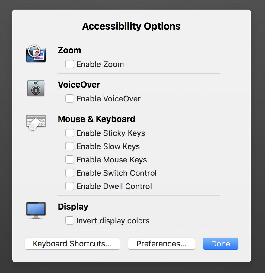 Access to Accessibility Options has also been improved: you can open a control window, in which you can toggle VoiceOver, Zoom, Sticky Keys, and more, by triple-pressing the new Touch ID button at the far right of the Touch Bar. This is much easier than the normal keystroke command of Function-Option-Command-F5.