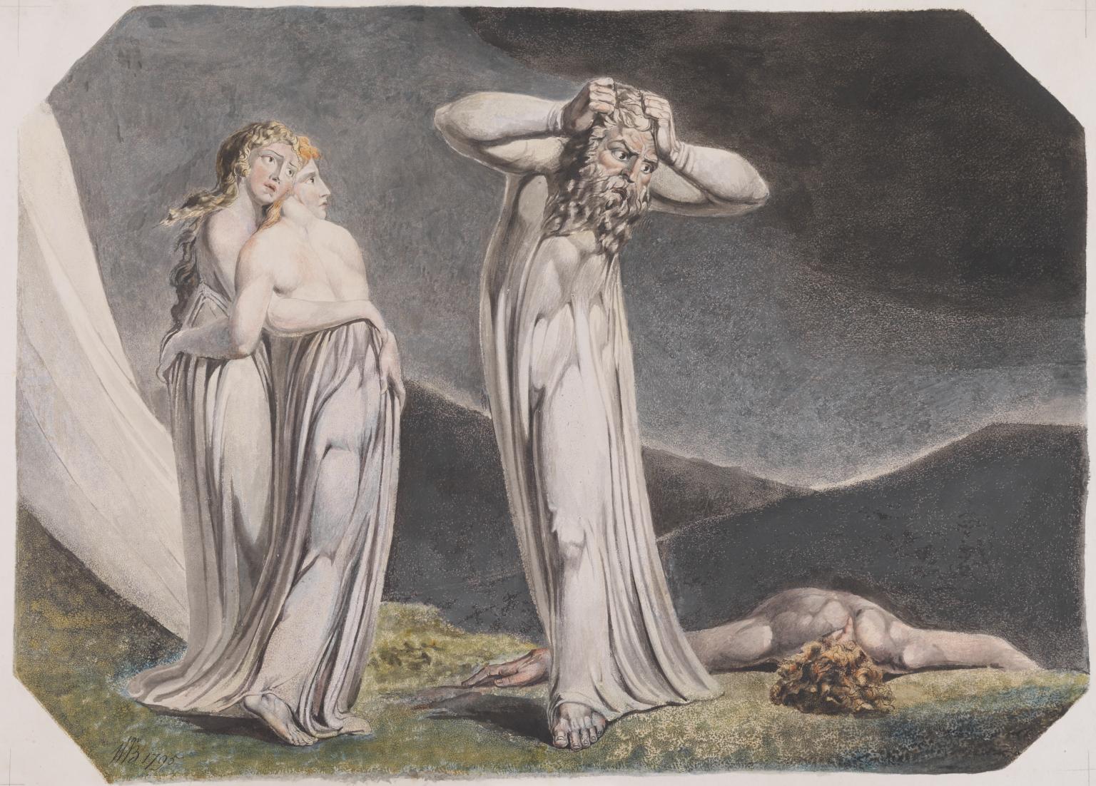Lamech and his Two Wives (1795) is the first impression of this depiction of an obscure story from the book of Genesis, chapter 4, verses 23-4, which Blake titled simply Lamech. A descendant of Cain (who killed his brother Abel), Lamech here tells his two wives how he has just killed a man for wounding him, and killed a boy for merely hurting him. One of the bodies is shown at the right, and the fearful wives embrace one another as Lamech seeks protection from the consequences of those killings.