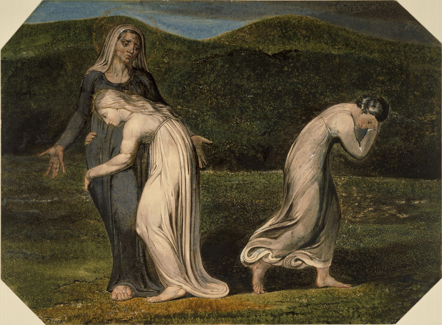Naomi Entreating Ruth and Orpah to Return to the Land of Moab (c 1795) is another first impression, showing a slightly more familiar Biblical narrative from the book of Ruth, chapter 1, verses 11-17. Naomi, seen at the left in a black robe, and her two daughters-in-law have become widowed. She decides to leave the land of Moab to return to her kin in Judah. Ruth, who is embracing her, remains devoted to Naomi, and returns with her, but Orpah, walking off to the right, decides to stay. Interestingly, because of her place in the lineage of David and so that of Jesus, Blake gives Naomi a halo, but not Ruth.