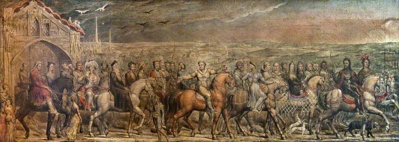 Sir Jeffery Chaucer and the Nine and Twenty Pilgrims on their Journey to Canterbury (1808) is a large and very detailed panorama of Chaucer and the Canterbury pilgrims who made up his Canterbury Tales. Blake’s catalogue for the 1809 exhibition gives a detailed account of the main characters included.