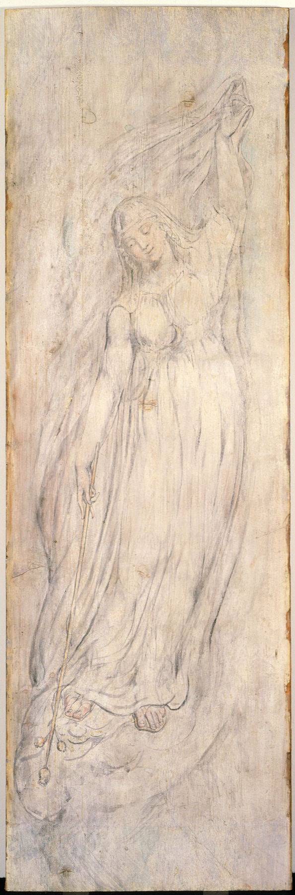 This Virgin and Child (1825), sometimes known as “The Black Madonna”, was painted using Blake’s former manner, with heavier layers of paint, so has darkened considerably. It has possibly been incorrectly dated on the basis of its inscription, which may not be original.