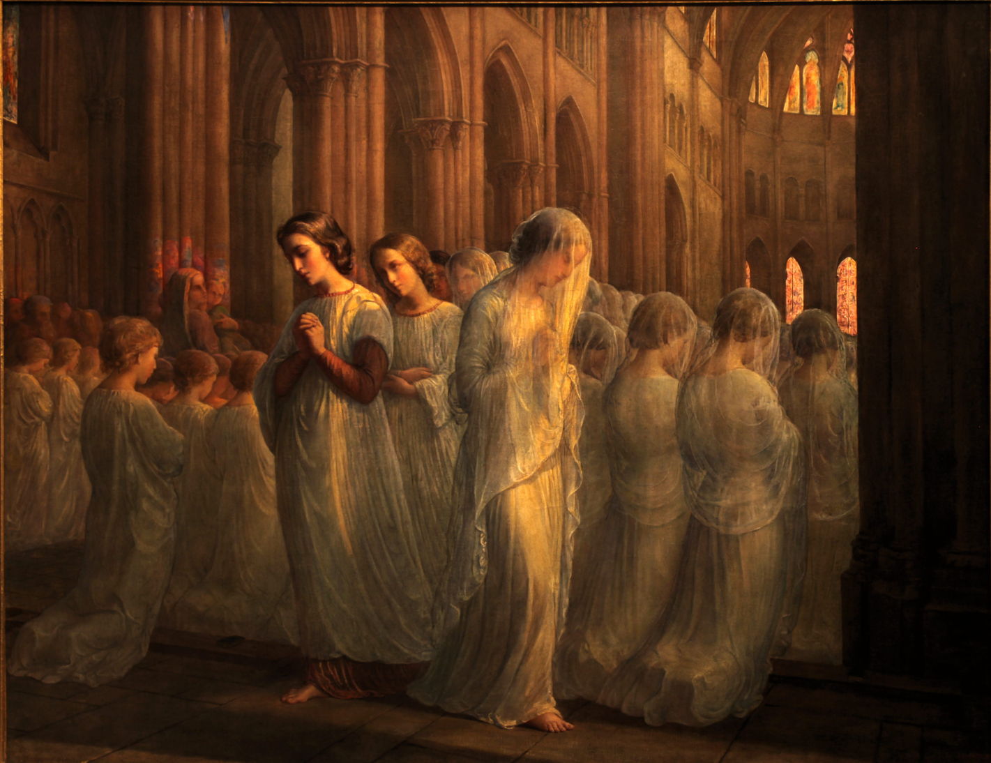 The pair are seen attending their first Holy Communion, which takes place in the nave of the Cathedral of Saint-Jean de Lyon. They are seen in the company of many other young people who are also receiving their first Communion, in a scene lit to emphasise the spiritual importance, with small pools of rich colours where the sunlight has passed through the stained glass windows.