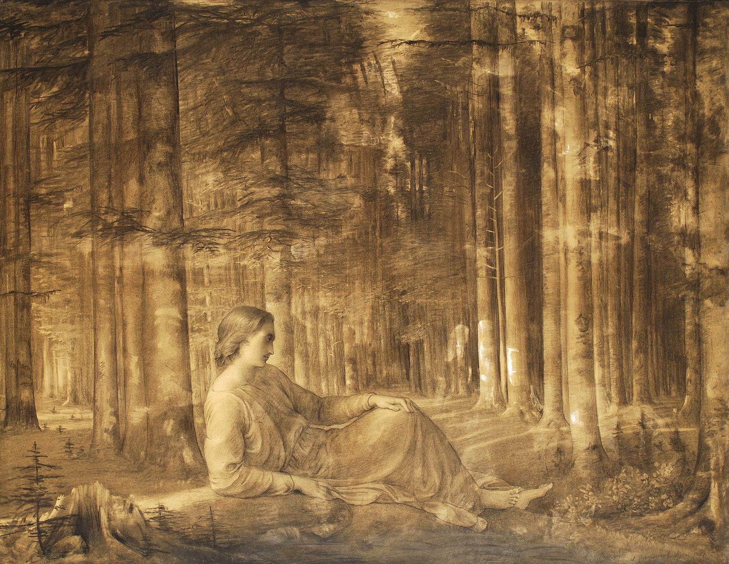 As the oil paintings had closed, so the drawings start with an image of solitude: the young man is now in a seemingly endless wood, leaning back and looking very pensive.