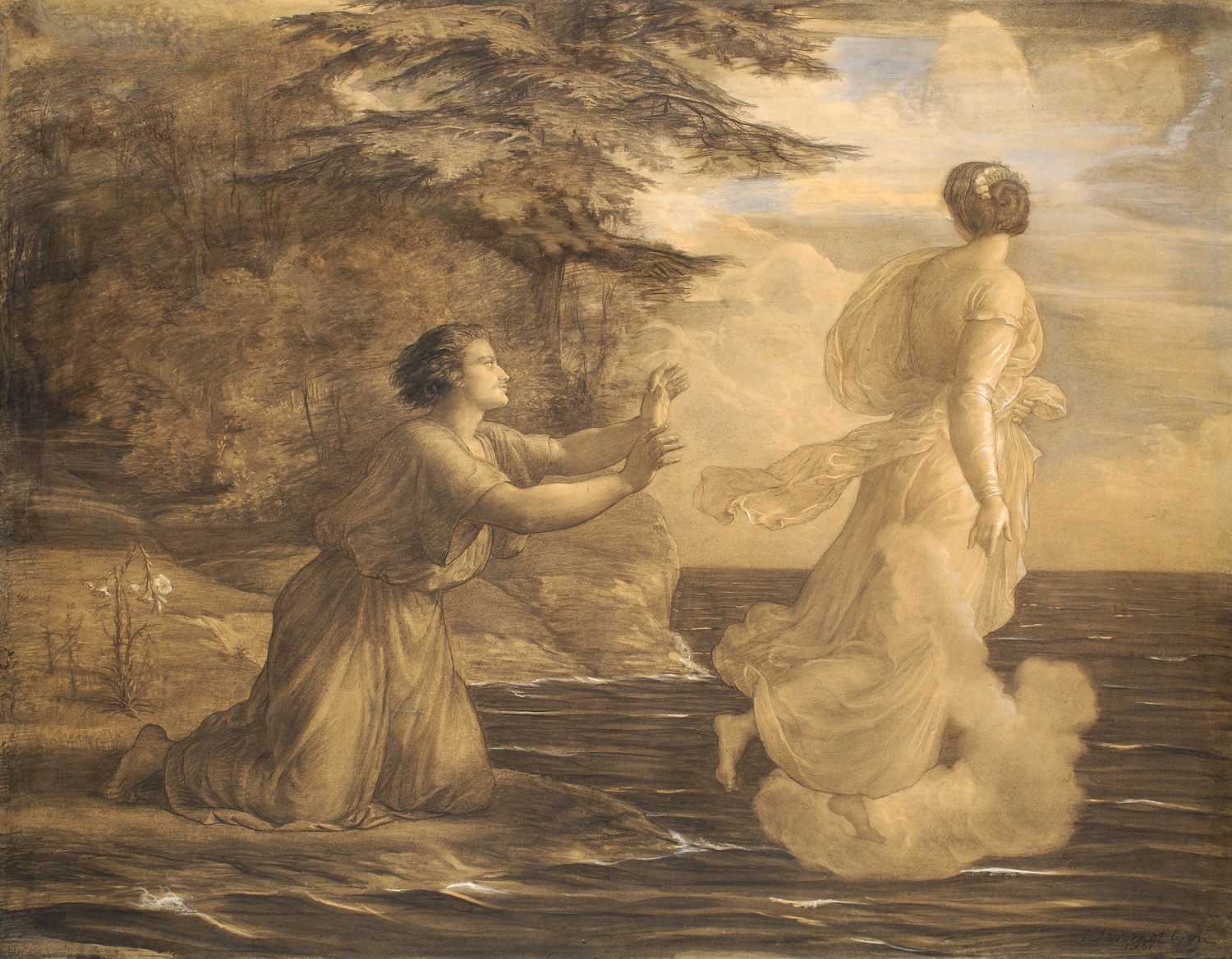 His love runs away from him, across the sea, as if she was just his dream of his soul again. Behind him the broken flowers reflect his broken love.