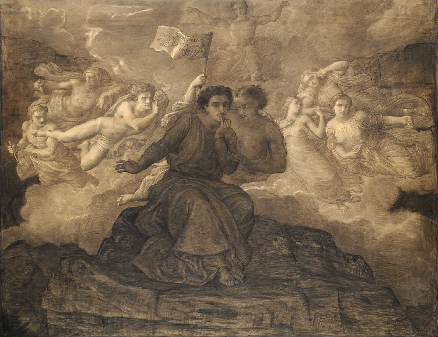 As he sits on a rock, his doubts now festering, an evil spirit draws up behind him, bringing with her the seven deadly sins. These are inscribed in Latin on the flag she bears, and embodied in the seven spirits which accompany her. He gives in to their temptation.