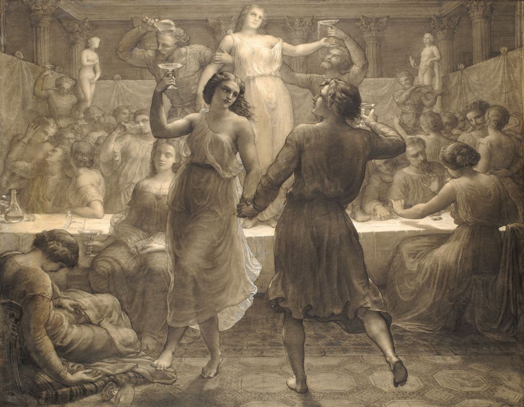 We next see him at a modern-day bacchanalian orgy, drink flowing freely, and dancing with a young woman whose virtue seems as scant as her dress. A long table, which is reminiscent of the scene for the Last Supper, is now being danced upon by an inebriated and wanton woman, and others are scattered around the room.
