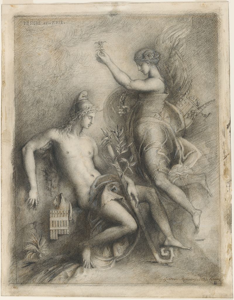 Over this period, Moreau had been working on several paintings, including one to commemorate Chassériau, and this preparatory drawing of Hesiod and the Muse (1857). It has also been claimed that he had started to paint some of his later and still unfinished works, including The Suitors, although Cooke considers that the paintings themselves were not started until after his return from Italy.