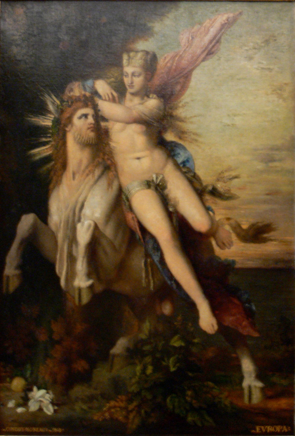 Almost universally, previous depictions of this myth have shown the start of the abduction, from the pastures of Phoenicia to the bull heading off to sea. Moreau’s white bull, with Europa riding a precarious side-saddle, here seems to have just emerged from the sea, so is presumably now on the island of Crete.