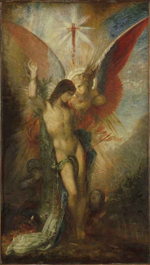 Moreau brings in an angel, whose huge-spread red wings fill the upper half of the panel, with a backlit crucifix above. These heighten the drama, and contrast with the fearful face of a friend (to the right of the saint’s knees), and the determined pose of one of the archers (to the left of the post). However, neither the saint nor the angel show any emotion in their expressions, in keeping with Moreau’s aversion to such theatrical techniques.