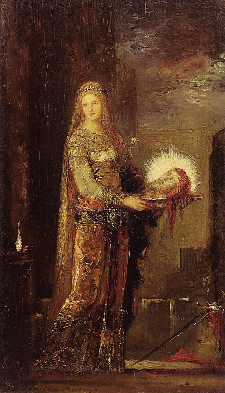 Salome Carrying the Head of John the Baptist on a Platter (1876) is a much more traditional scene, which may have led Moreau on to the motif of his Apparition. Notable in these paintings is that Salome is shown not as an evil or lustful woman, but almost as the heroine of the story.