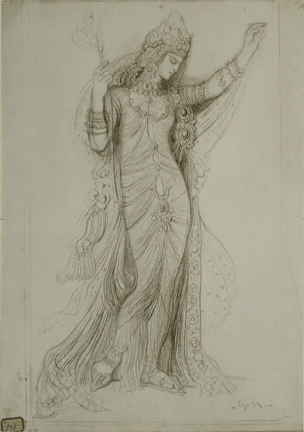 Moreau had probably started work on a painting of Salome during the Franco-Prussian War, and this is one of several sketches which he made exploring ways in which he could depict its femme fatale. Although these drawings differ slightly, he was quickly concentrating on an image of her which would show her dancing, with her left arm stretched out and up, but which would still seem quite static, as opposed to an action position.