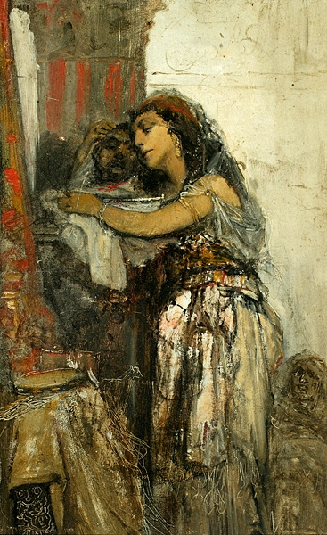 Most unusually, Regnault shows Salome alone, equipped with a short sword with which to behead John, and the large platter to contain his head. She is dressed as an ‘oriental’ (North African) dancing girl, and Regnault had originally intended to make her appear North African too. On her face is a knowing smile, of someone who is about to get just what they wanted. But this is all implicit, and there is nothing here which actually contradicts the biblical account, or explains why it might be Salome, rather than her mother, who wants John dead.