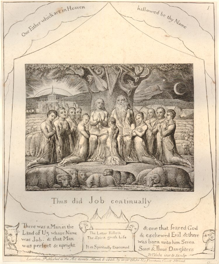 There Was a Man in the Land of Uz is the equivalent watercolour which Blake painted for Linnell in 1821, with few and minor changes from that in the set owned by Thomas Butts, such as the family kneeling rather than standing in prayer.
