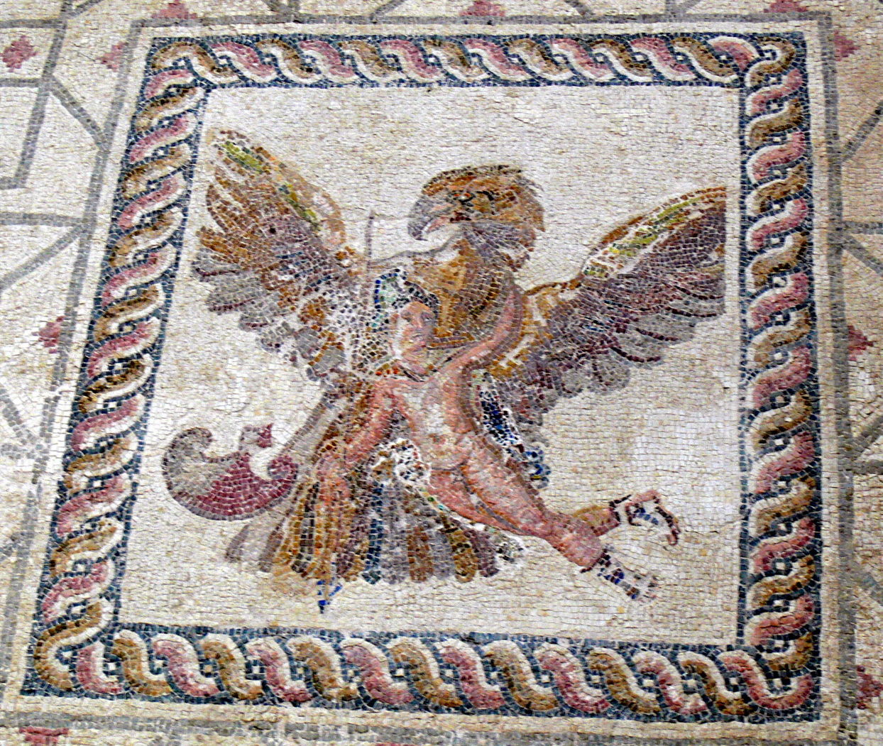 This much later mosaic from Paphos on Cyprus, about 150 CE, is unambiguous about the story of Zeus abducting Ganymede.