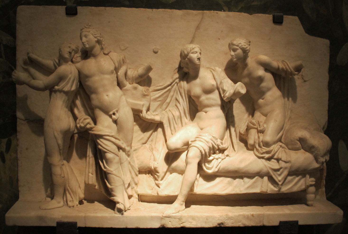 Less flattering, perhaps, is this marble relief kept in the Museo Archeologico Nazionale di Napoli, most probably showing Alcibiades and the Courtesans, although it had earlier been thought to be of Apollo and three nymphs. Why, I wondered, was this great general being remembered by an incident from the more personal side of his personal life?