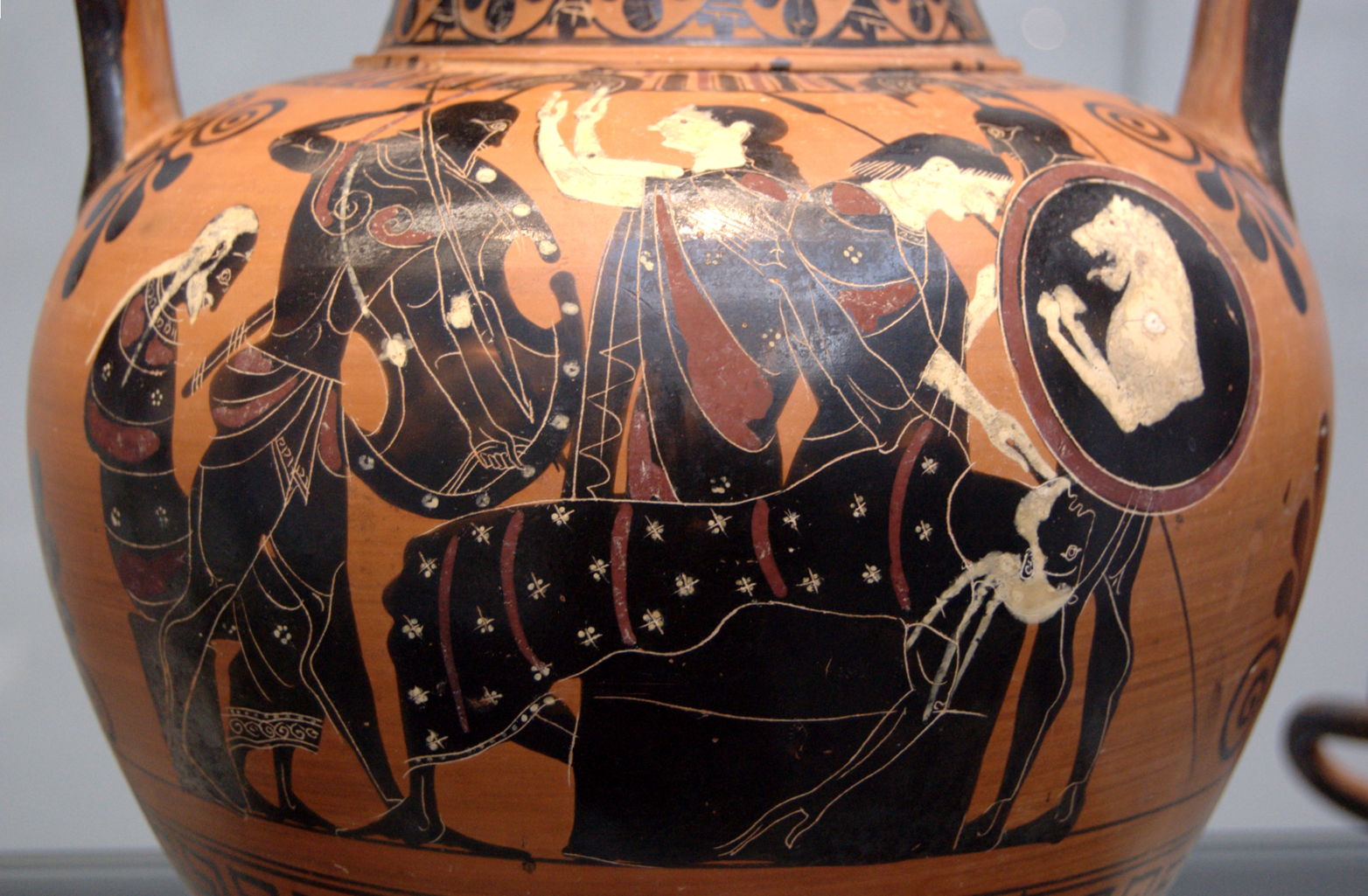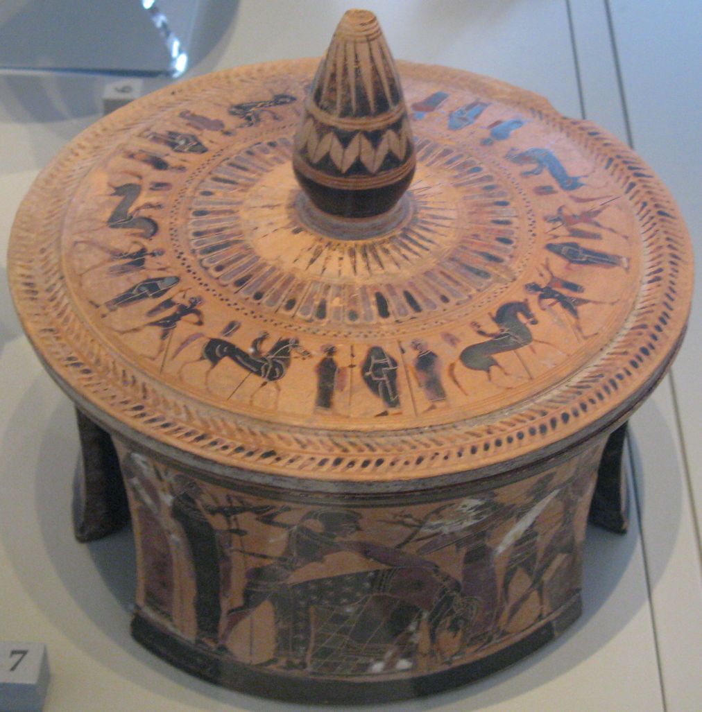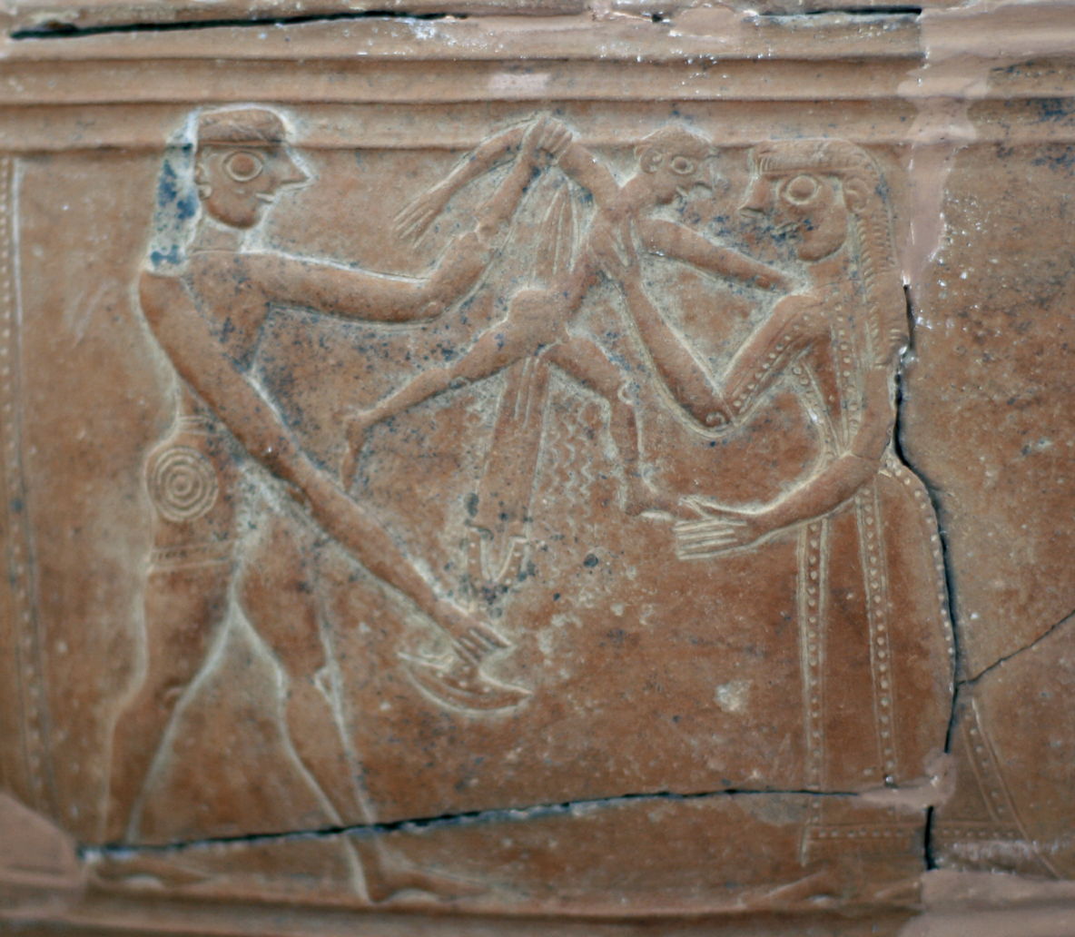 Although it is not easy to make out the details on this Boeotian black-figure tripod-pyxis from Tanagra, it appears to show a Greek warrior swinging the body of a child from his right arm, using it as a weapon to beat a Trojan, who is laid back over an altar. It dates from about 560-550 BCE.