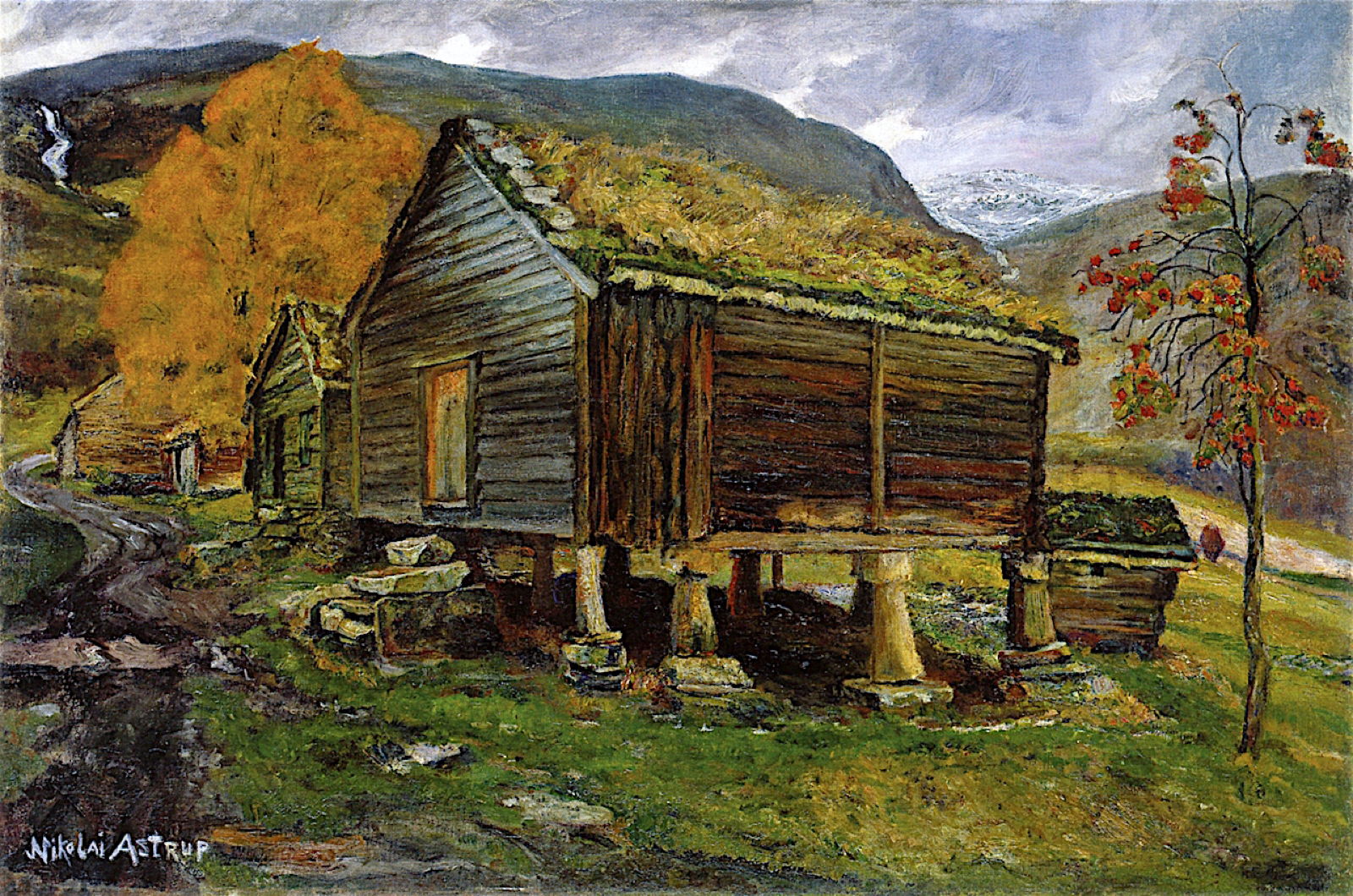 Storehouse in Jølster (1902-05) was originally titled Sad Autumn Day by Astrup, although there seems no explanation for that reading. It was certainly far from being a sad painting, as it was and remains one of his most acclaimed works.