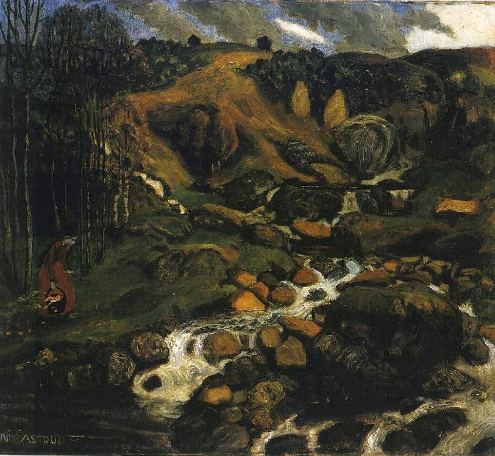 Warmth Comes to the Ground (1903) shows a woman carrying a pail full of glowing embers beside a stream, in the early spring, as the ground thaws from the past winter. This illustrates a folk tale that the ground is thawed out using those embers, ready for the spring weather to complete the job.
