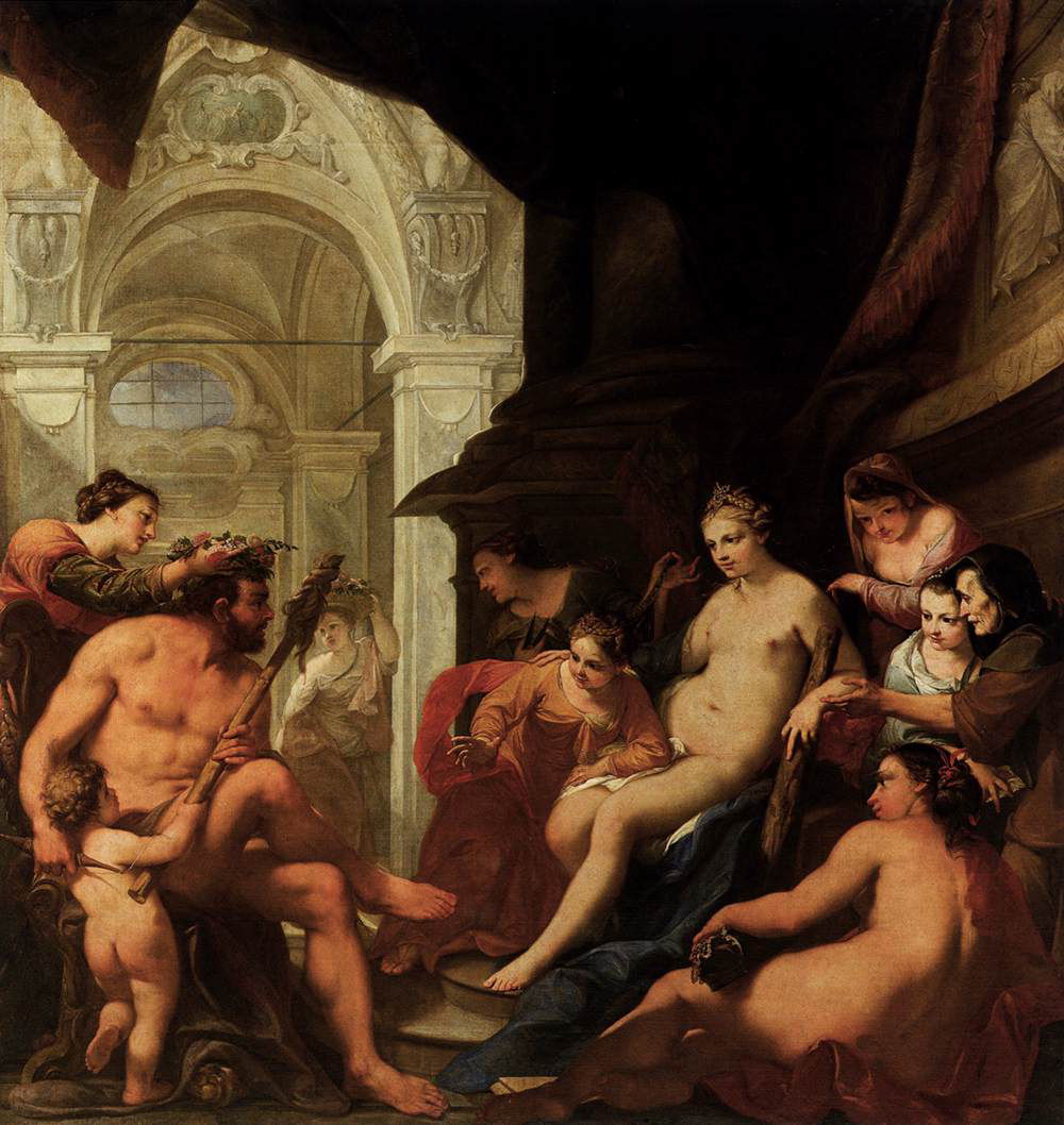 Antonio Bellucci cedes Hercules’ club to the queen, but not (yet) the lionskin, in his Hercules in the Palace of Omphale (c 1698). But look carefully at the directions of gaze of Omphale and her attendant women: they are not looking Hercules in the eye, although he appears to be remonstrating with the queen as a floral crown is put on his head, and a distaff in his left hand.
