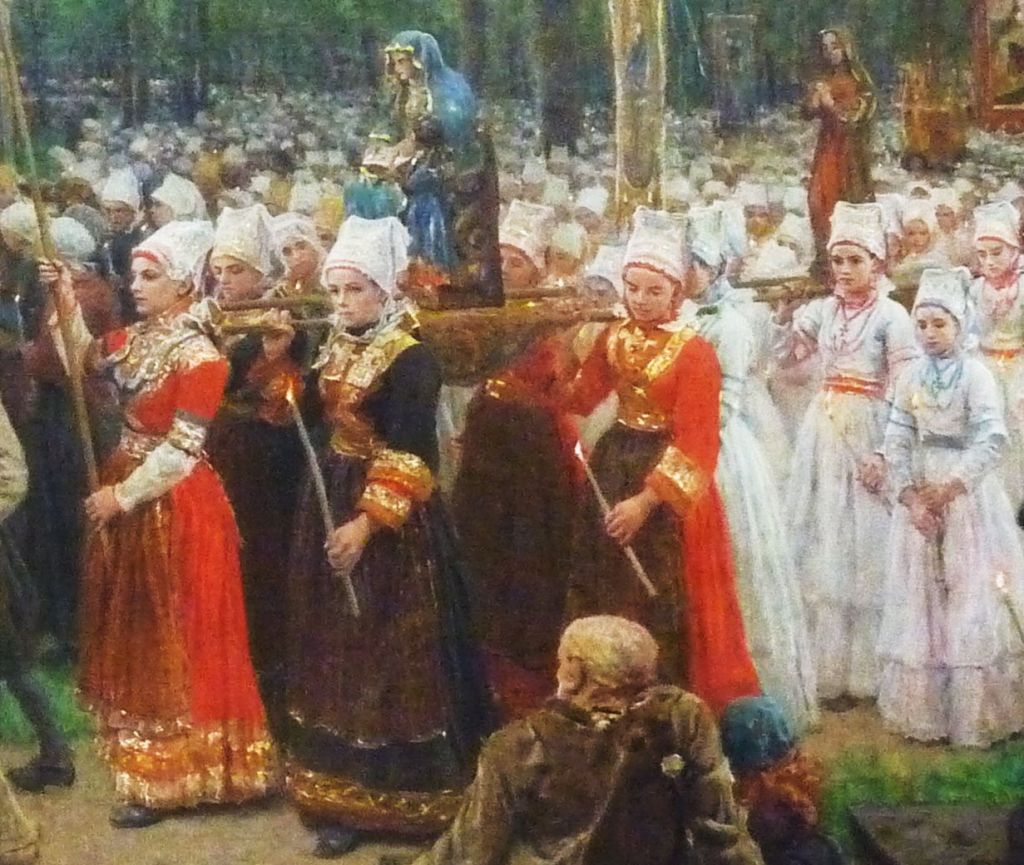 Breton’s last great painting of the crowds at a religious rite was The Pardon of Kergoat in QuĂ©mĂ©nĂ©ven in 1891 (1891). He had accumulated numerous studies, sketches, and probably photographs too showing the masses who attended this small inland village near Quimper in Brittany, on the third Sunday in August, 1891. They came to ask the ‘Virgin of Pity’ and ‘Christ in Agony’ to cure their ailments.