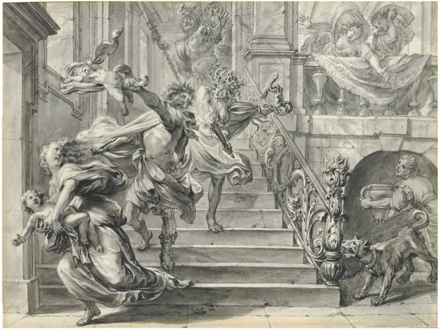 Godfried Maes’ Athamas Tearing his Children Apart (1664-1700) is a fine chalk and pen drawing showing Athamas dashing the infant Learchus against the palace walls, and Ino, clutching Melicerta, heading very rapidly towards the door in her bid to escape. To make his account even more explicit, he includes the figure of Tisiphone further up the staircase. I suspect that this was destined to be engraved and used as a print, as a couple of other drawings of this story were.