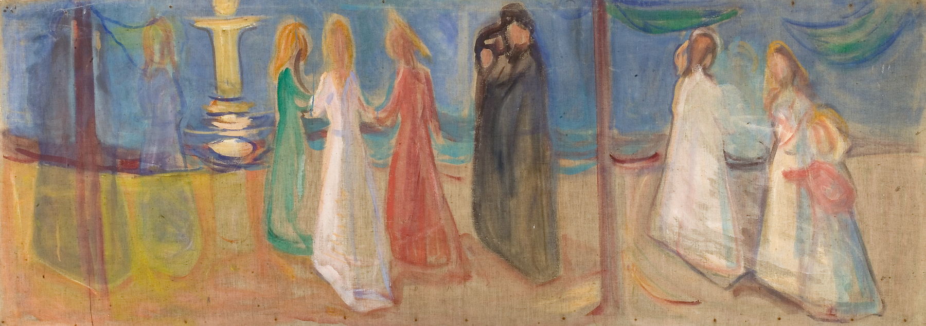 Dance on the Beach or Dance on the Shore (c 1900) was among the paintings made by Munch to enlarge and enhance his original Frieze to its 1902 form. It shows a dance taking place on the shore of a fjord, viewed from the shore, through the pines, much as in The Voice. This appears to be a simple, happy occasion featuring five different women, the colour of their dresses linking back to Red and White above, and forward to The Dance of Life in the next section of the Frieze.