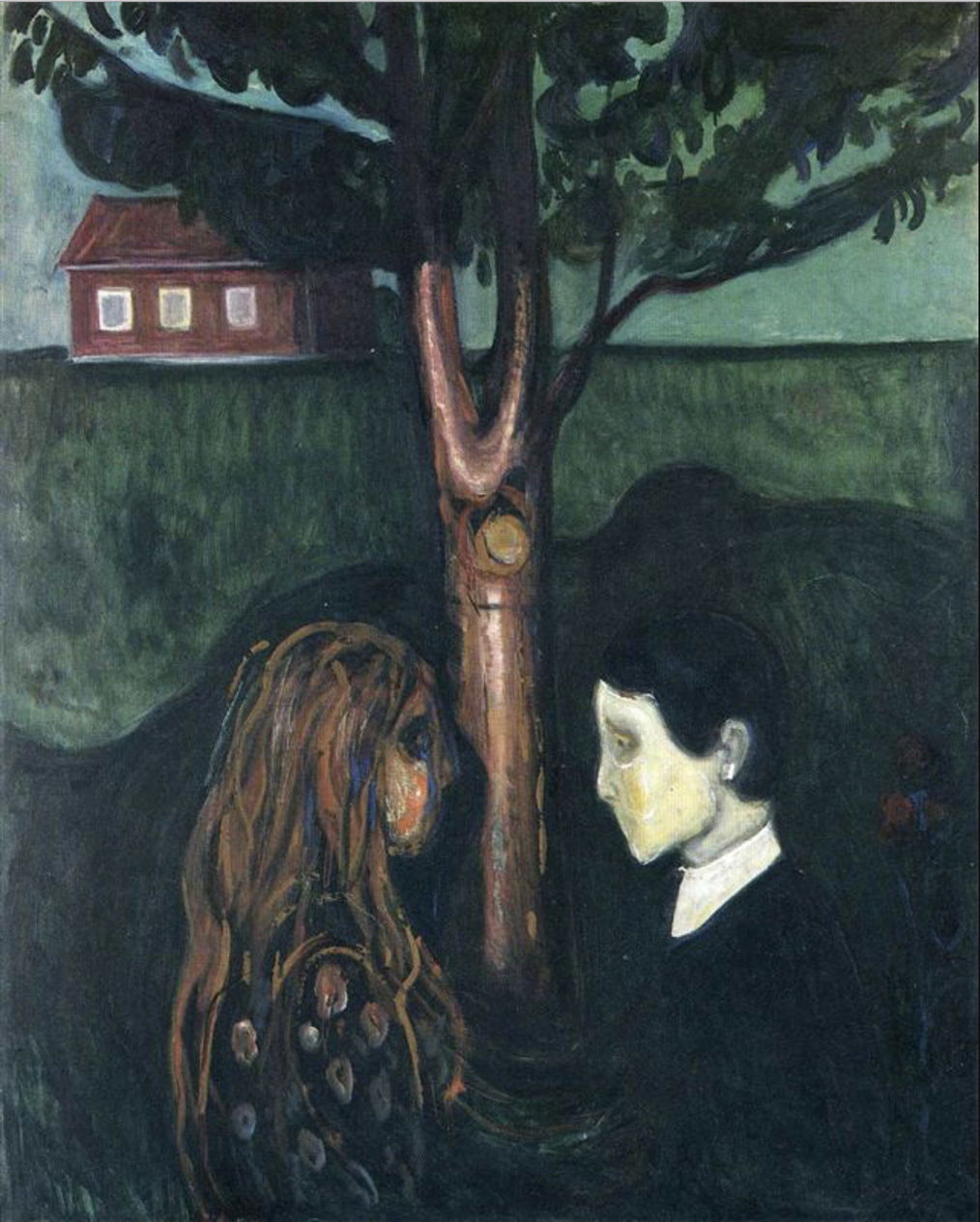 Later, in his panel Desire (1906-07) from the Reinhardt Frieze, Munch re-arranged the figures in a lighter and brighter setting, under the constant ‘i‘ of the moon and its reflection.