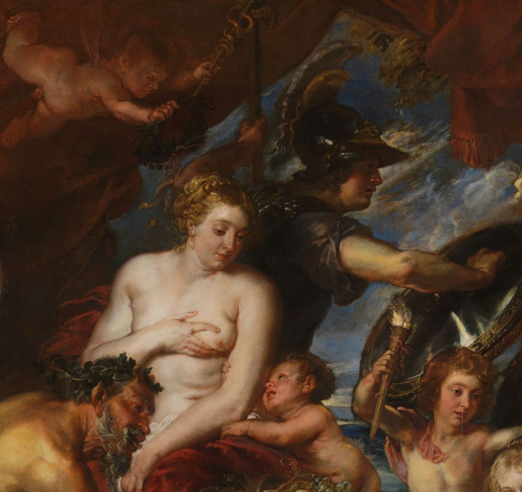 The figures of Ceres and Plutus are almost identical to those of Venus and Cupid in Rubens’ earlier Venus, Mars and Cupid (c 1633), which introduces ambiguity to her figure. However, in this painting Cupid is shown with wings, and his traditional bow and arrows. In Peace and War, the infant is clearly not Cupid as he has neither wings nor bow and arrows: he is Plutus there.