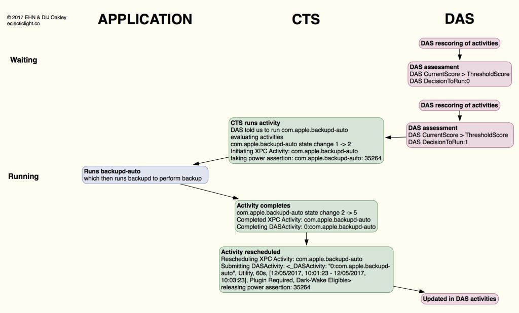 CTS then records that “DAS told us to run com.apple.backupd-auto”. It may subsequently evaluate activities itself before making the state change in backupd-auto from 1 to 2. It next initiates XPC activity with the service, and runs backupd-auto. This in turn launches backupd itself, which does the heavy lifting for the backup proper.