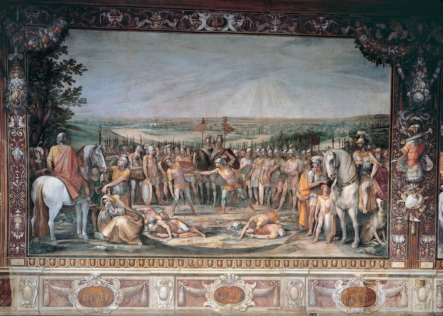 Giuseppe Cesari’s huge fresco Combat of the Horatii and the Curiatii (1612-13) shows the last Curiatius and Horatius (to the right) in the final phases of combat, as the Roman is about to deliver the coup de grace. Publius Horatius’ sister is shown at the left, by the bodies of the two dead Curiatii.