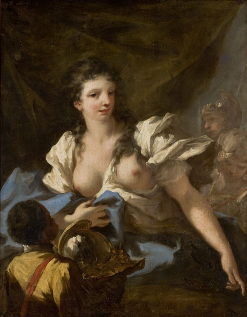 Giovanni Antonio Pellegrini may have painted two different versions of Queen Tomyris. This, from 1719-20, shows her, bare-chested, pointing down with her left hand. In front of her, a page holds a warrior’s helmet. In the background a maidservant appears to be assisting with her dress, and behind her is a man dressed for battle in his helmet.