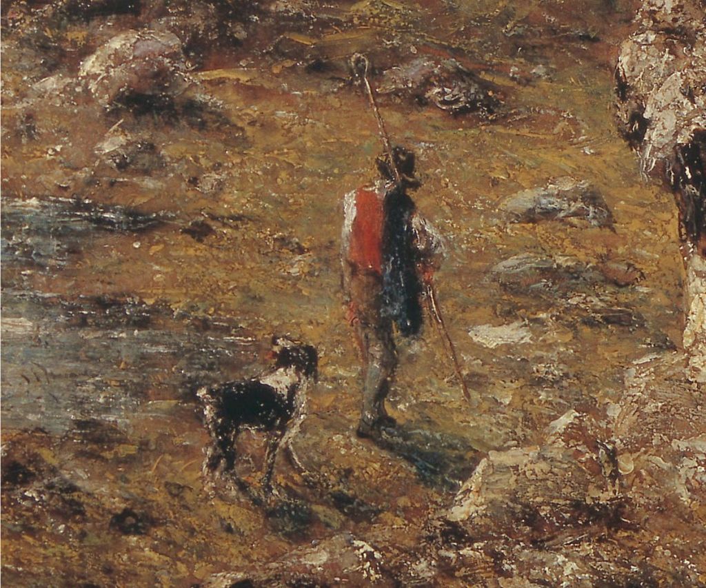 By the finished work, the splendid Hadleigh Castle, The Mouth of the Thames – Morning after a Stormy Night (1829), the basic disposition of those figures has changed little, but Constable has changed each to suit his image. The shepherd, still carrying his long crook, is separated from his dog, and has lost his sheep, which have become scattered rocks (detail, below).