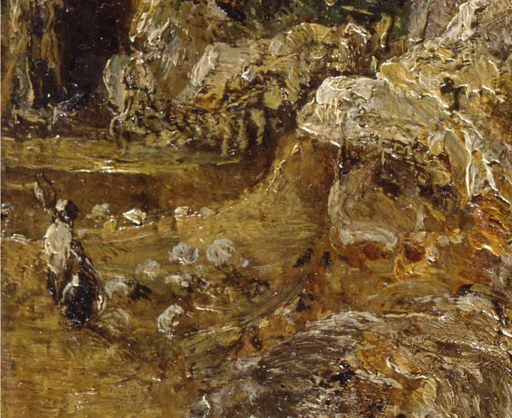 As his paintings matured towards their finished state, so their figures became less gestural, and more highly detailed. In this view of The Cornfield (1826), a boy shepherding the small flock of sheep has paused to drink from a pond. The figures draw the viewer’s gaze into the cornfield, then on to two people in the distance, silhouetted against the water-meadow in the background.