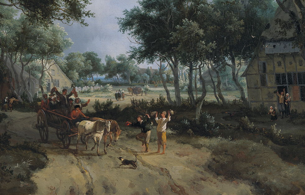 Hobbema’s forests are alive with those who live in their hamlets and travel their tracks, as seen in his Forest Landscape with a Merry Company in a Cart (1665). A passing cart brings people out of their houses to wave, and a dog runs in front of the horses (detail, below).
