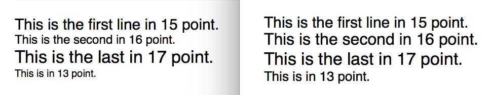 Next, Mail shouldn’t be mixing the two different schemes for setting font size, particularly as the old HTML 1-7 method only relates to itself, and not to absolute font sizes. To mix them is asking for this sort of rendering issue.