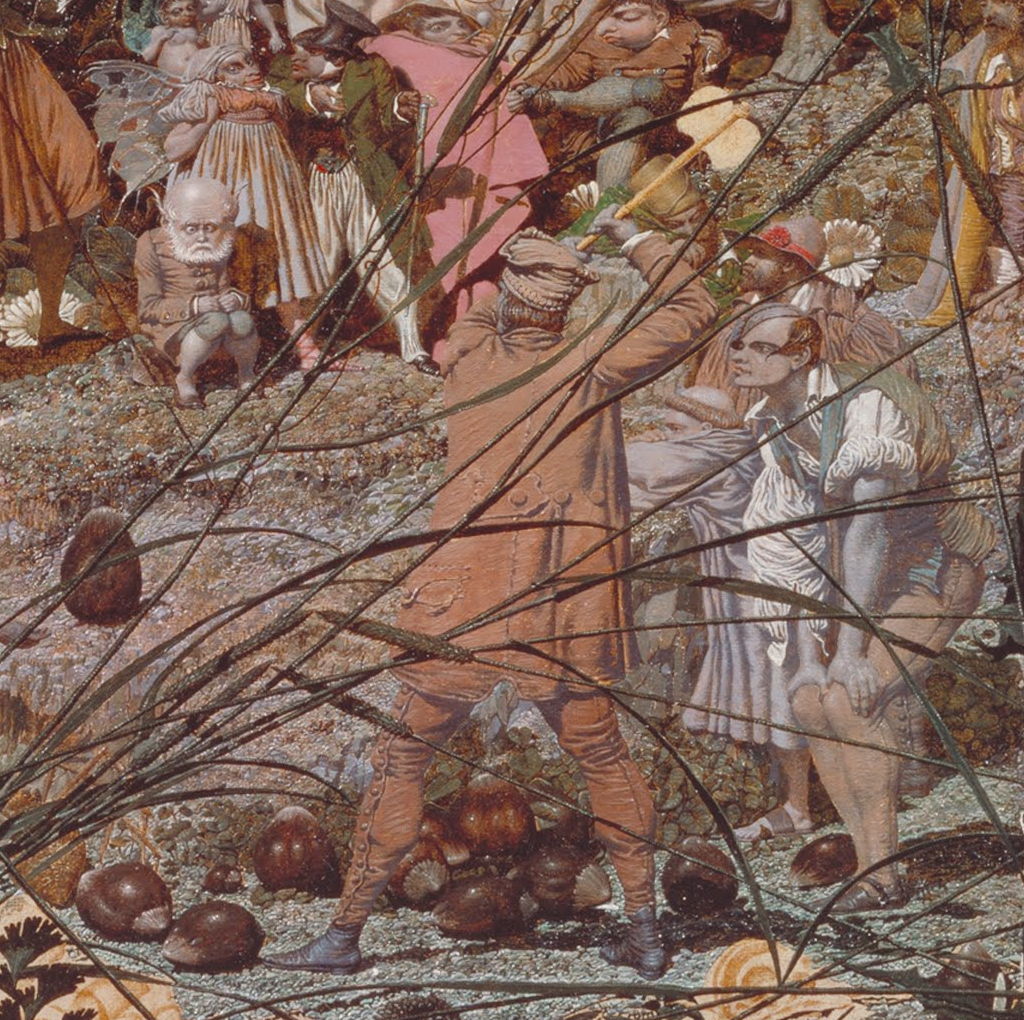 We see Dadd’s scene through fine stalks of Timothy grass, the foreground with scattered hazelnuts and plane tree fruit. Although its perspective is flattened, the figures in the lower half of the painting are stood on a gently rising grassy sward, behind which is a steeper bank and stone walling (prominent at the right). Those in the upper third of the painting appear to be on another level, which rises more steeply towards the top edge.